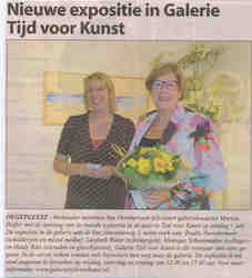 Opening bij Tijd voor kunst. Achter de wethouder en de galeriehoudster is mijn tweeluik; `Zeilen op de wind van vandaag` te zien